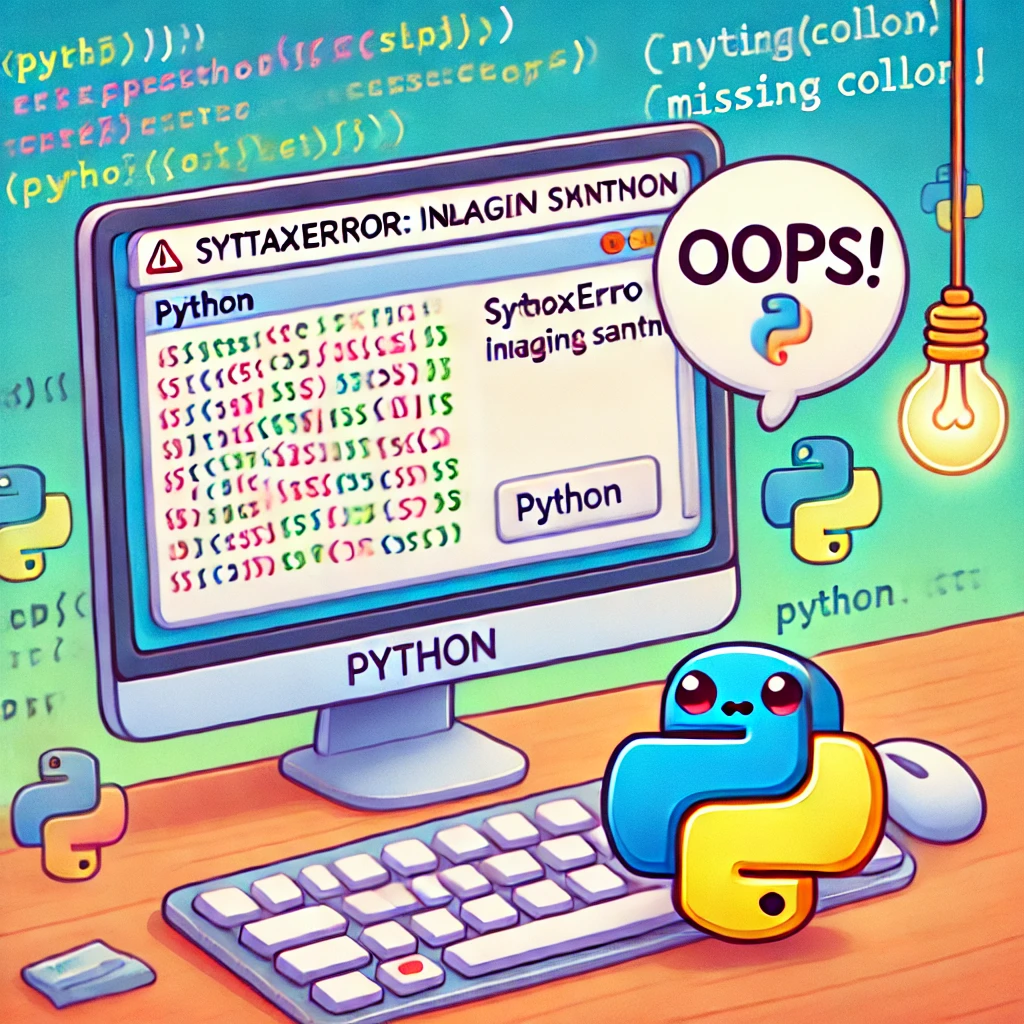 Python은 문법 오류에 굉장히 민감하므로, 콜론, 괄호, 따옴표 등 작은 실수 하나로도 SyntaxError가 발생할 수 있습니다. 에러가 발생한 줄과 바로 위 줄을 함께 확인하세요.
